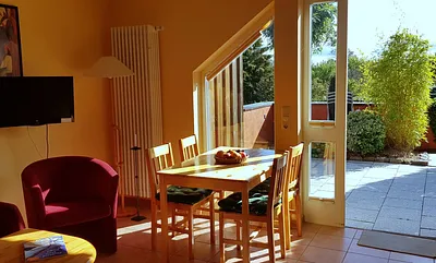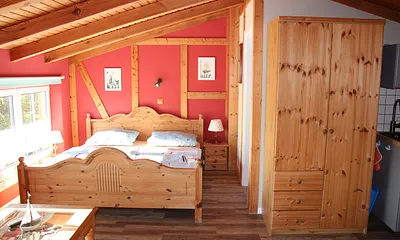 30 qm, Wohn/Schlafraum mit Doppelbett, Esstisch und schöner alter Kommode, offene gut ausgestattete Küche, Boddenblick, Terrasse, Naturgarten, sehr gutes Handy-Netz