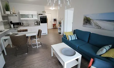 50 qm, Wohnrfraum mit Essecke, offene Küche,1 Schlafzimmer mit Doppelbett und TV, Balkon, WLAN, HiFi, Haustiere erlaubt, Direkt hinter der Düne, Meeresrauschen