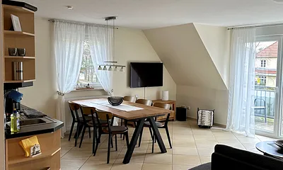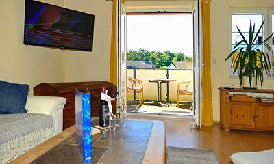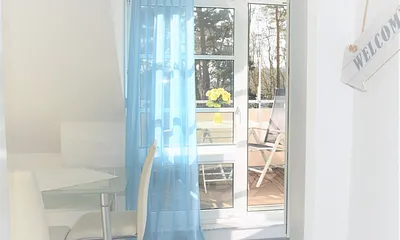 45 qm, Wohnraum mit Esstisch und Küchenzeile, 2 getrennte Schlafzimmer, Genießen sie auf dem großen Balkon die Morgensonne bei einem ausgedehnten Frühstück und spüren Sie die Nähe zur Ostsee und hören das "Meeresrauschen". Zur Verfügung stehen Ihnen selbstverständlich auch Balkonmöbel.