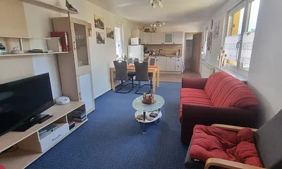 max. 3 Personen, 35 qm, Wohnraum mit Essecke, ausziehbare Schlafcouch, 1 Schlafzimmer mit Doppelbett und Küche, 2 Kochplatten Ceran, Mikrowelle, Kühlschrank mit Gefrierfach, Wasserkocher, Kaffeemaschine, Toaster, Essbereich mit 3Stühlen, Balkonmöbel, Smart- TV