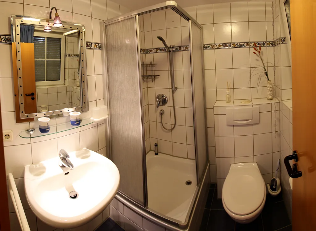 Da das Bad ziemlich klein ist wäre ein kleines Regal an der Wand nicht schlecht als Ablagefläsche.