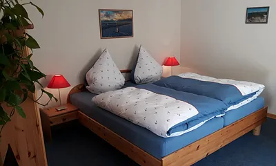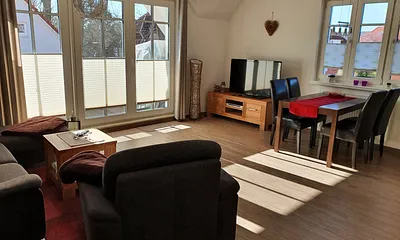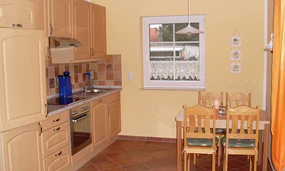 96 qm, Wohnzimmer, Küche mit Essbereich, 1 Schlafzimmer mit Doppelbett & 1 Schlafzimmer mit 2 Einzelbetten, ebenerdige FeWo, Kamin, Gäste WC, Terasse