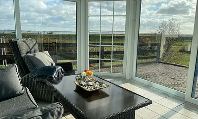 70 qm, Kombinierter Wohn- u. Essbereich, 2xSchlafzimmer m. Doppelbett, 1xSchlafzimmer mit Schlafsofa, Wintergarten mit fantastischem Blick auf den Deich