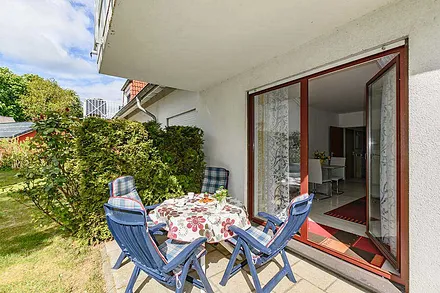 • 50 qm, Wohn-Schlafraum mit Küchenzeile, 1 Schlafzimmer mit Doppelbett, Badezimmer, Terrasse, Terrasse mit Strandkorb