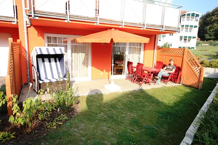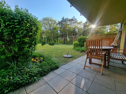 61 qm, stilvolle 3-Raum-Wohnung mit Terrasse, priv. Sauna, Tageslichtbad, 2 Schlafzimmer, allergikerfreundlich, private Sauna, fantastischer Ausblick von der Südwest-Terrasse auf den Küstenwald und den Sonnenuntergang