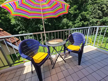 45 qm, gemütliche 2 Raumwohnung im EG mit Doppelbett, Nordterrasse mit Blick zum Wald, Waschmaschine, Außenabstellraum bietet Platz für Fahrräder o. ä. + E-Anschluss