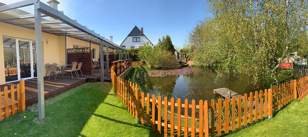 „Große saubere Ferienwohnung,Terasse mit Blick auf Teich und eigene Wiese.