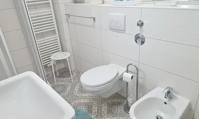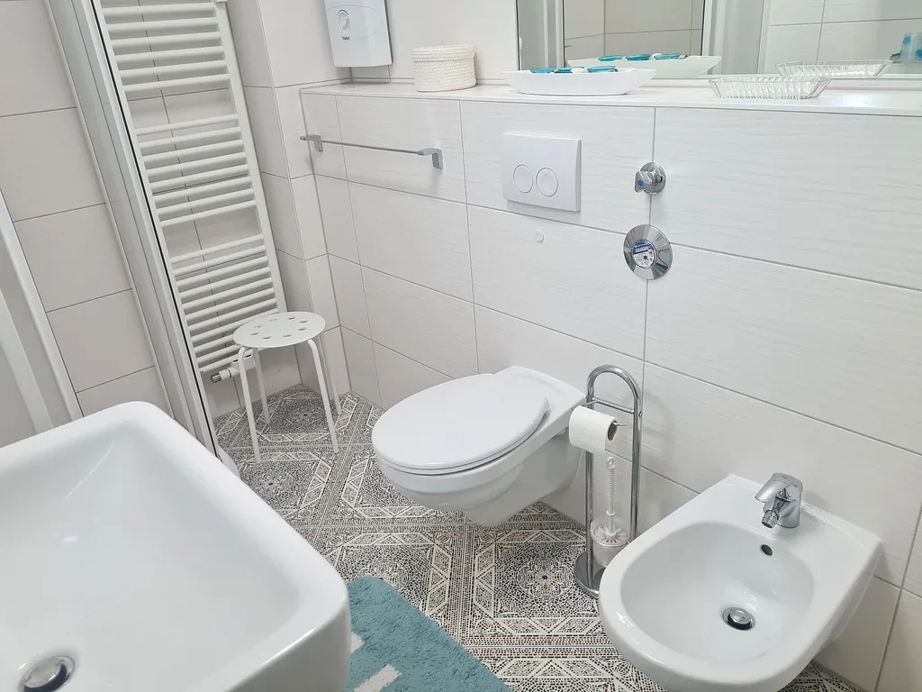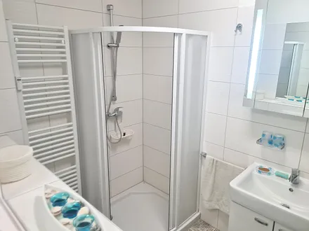 Schönes Bad mit vielen Ablageflächen, welches uns sehr guten Nutzen geleistet hat.