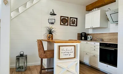 40 qm, Wohnraum mit Essbereich und offener Küche, Schlafraum mit Doppelbett für 2 Pers., 43 Zoll Smart TV mit Magenta TV, Netflix, Prime Video, Disney und RTL+, USB Ladeanschlüsse an den Nachttischen, Safe, Fliegengitter, Ambient-Beleuchtung, Regenwalddusche