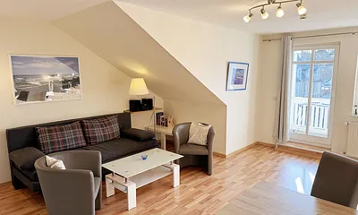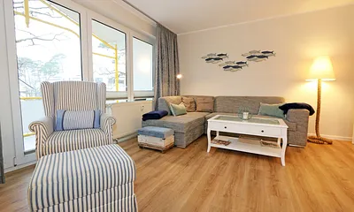 80 qm, Wohnbereich mit gemütlicher Couch, zwei Sessel, Leselampe, Smart-TV, Blu-Ray-Player, Mini-Stereo-Anlage mit DA