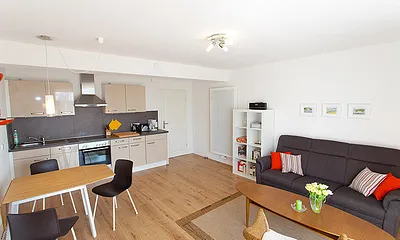 40 qm, Moderne Wohnung mit optisch getrenntem Wohn- und Schlafbereich, komfortabel möbliertem Balkon mit Seeblick. EG, WLAN, möblierer Balkon mit schönem Meerblick, Münzwaschmaschine und -trockner sowie Fahrradraum im Haus. Außenstellplatz am Haus.