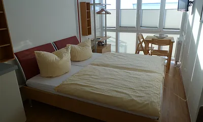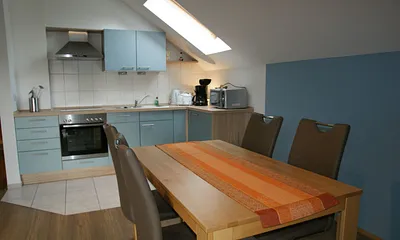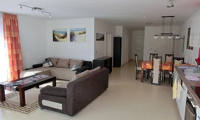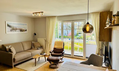 56 qm, moderne Fewo: Wohnzimmer mit Küchenzeile, 2 Schlafzimmer, Wannenbad, Balkon, 2. OG, Strandkorb am Strand, 2xTV, WLAN, Balkon, Strandkorb von Mai - Sptember inklusive, Parkplatz