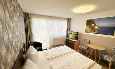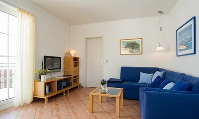55 qm, Komfortables Wohnzimmer mit TV, Schlafcouch und Küchenzeile, Schlafzimmer mit TV, 2.OG mit Fahrstuhl, 2xTV, elektrische Außenrolläden, Südost-Balkon, Sauna im Haus, Strandkorb