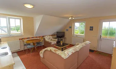 70 qm, großer Wohnbereich mit Couch, Couchtisch, LCD-Fernseher in HD-Qualität und Satelliten-Anschluss