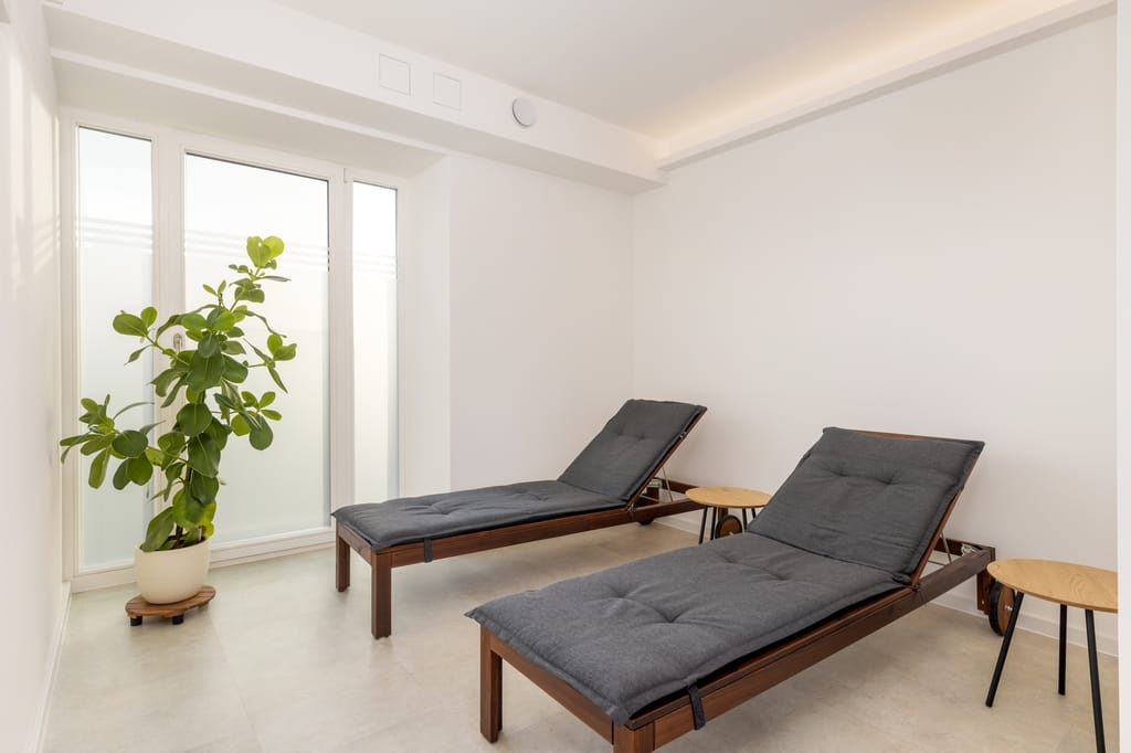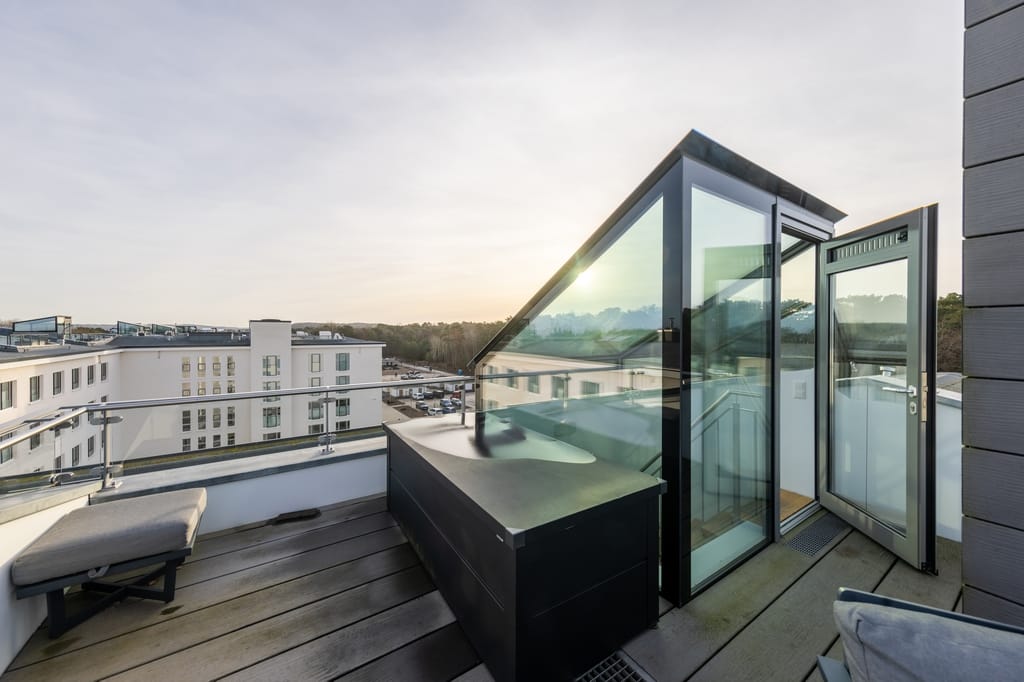 Es steht Ihnen im Saunabereich eine gemeinschaftliche Dachterrasse zur Verfügung.