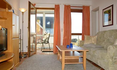 54 qm, 2,5 Zimmer, 1 Schlafzimmer m. Doppelbett (1,60 m), 1 halbes Zimmer m. 1 Einzelbett, Wohnraum, Balkon m. Seeblick, (Südwest), Internet