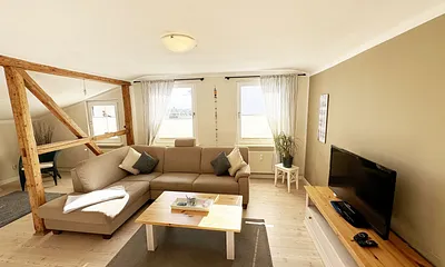 45 qm, Wohn- Schlafraum mit Essecke, ausziehbarer Schlafcouch für 2 Pers, 1 Schlafzimmer mit Doppelbett und Liege, Dachschräge, Laminat Fussboden