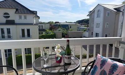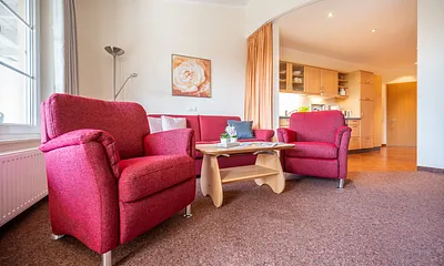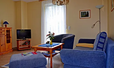 45 qm, 1. Zi: Doppelbett und Sitzecke im Erker, Schreibtisch. 2. Zi.: Etagenbetten sowie Küche mit Esstisch, Wintergarten als Erker (Hauptraum)