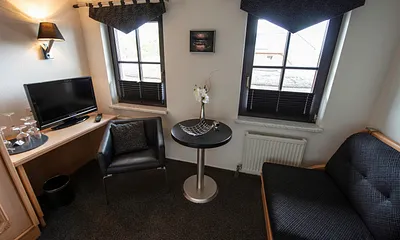 20 qm, Doppelbett, Tisch mit Stühlen vor der großen Fensterfront, Wintergarten als Erker, nur Miniküche