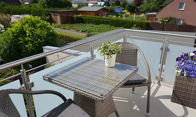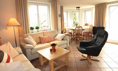 55 qm, Wohnzimmer m. Essecke im Turm, Schlafzimmer f. 2 Pers. Ruhe- u. Lesezimmer mit Schrankbett f. 1 Pers., Ab 1. Mai bis 15.Sept.Strandkorb, WLAN, Telefonflatrate ins Deutsche Festnetz