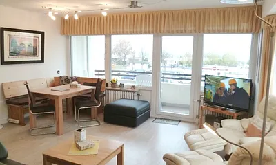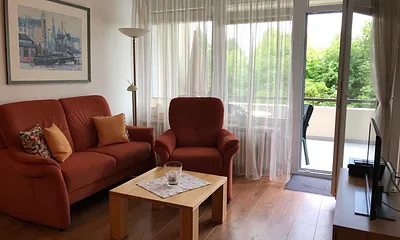 57 qm, Wohnzimmer mit Schrankbett (2 Pers.) 160 x 200 cm, Höhe 70 cm / Schlafzimmer mit 2 Einzel-Betten 80 x 200 cm, Süd-Balkon mit Markise, alle Fenster mit Außenrollläden, PKW-Platz in der Tiefgarage