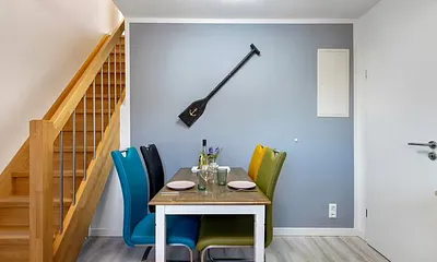 55 qm, Wohnzimmer m. Schlafcouch für 1 Pers., 1 Schlafzimmer mit Box-Spring-Doppelbett, 1 Kinderbett (insges. nur 3P), 3 Stufen vom Flur in die Küche, Fahrradschuppen, Waschmaschine, Safe..