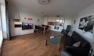 58 qm, Wohnraum mit Küchenzeile und Essecke, 1 Schlafzimmer mit Doppelbett, 1 Schlafzimmer mit Einzelbetten, Strandkorbnutzung inklusive! u.a. Küche (mit Spülmaschine) und Bad modernisiert
