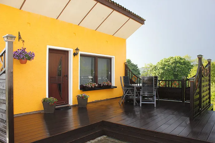 „Sehr nette, hilfsbereite, unkomplizierte Vermieter! Diese wohnen direkt nebenan; gegenüber ist auch direkt ein Haus, aber man ist sichtgeschützt auf eigener Terrasse mit wunderschönem Blick ins Grüne.