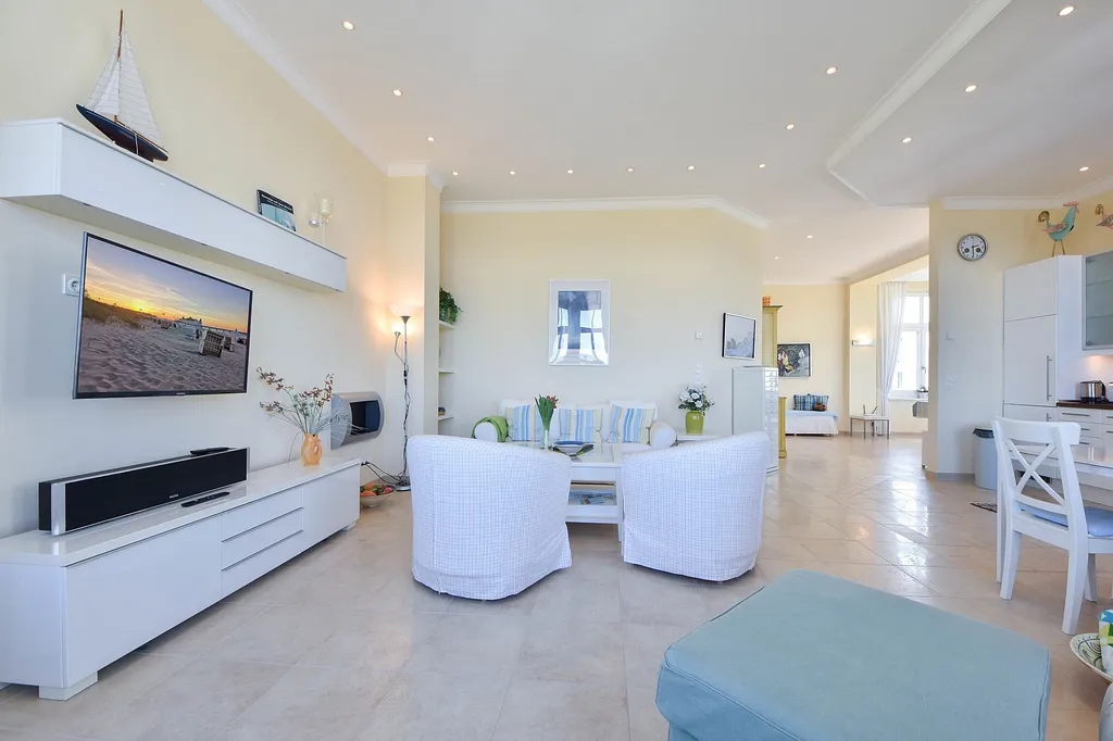 „Herrlicher Seeblick. Die Tiefgarage ist top. In den Sesseln und Sofa im Wohnbereich sitzt man sehr tief, Korbsessel wären ideal. HD-Fernsehprogramme nur in der Grundversorgung (ARD, ZDF usw.) vorhanden. Das abgebildete Fernrohr ist nicht da. Ein Backofen wäre wünschenswert.“