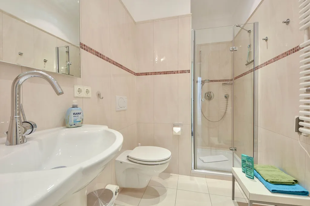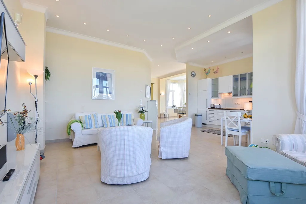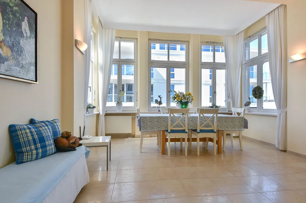 „Teure Wohnung, aber großzügig geschnitten und optimal für 3-4 Personen geeignet. Die Lage und die Sicht auf die Ostsee sind das Beste. Parkplatz inklusive in der Tiefgarage. Fahrstuhl vorhanden.