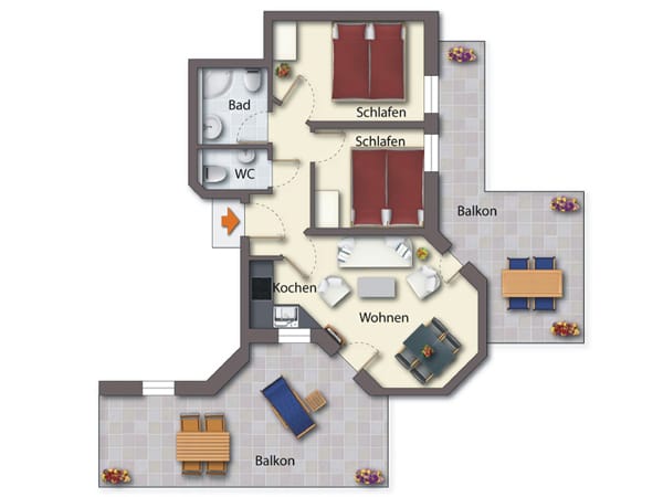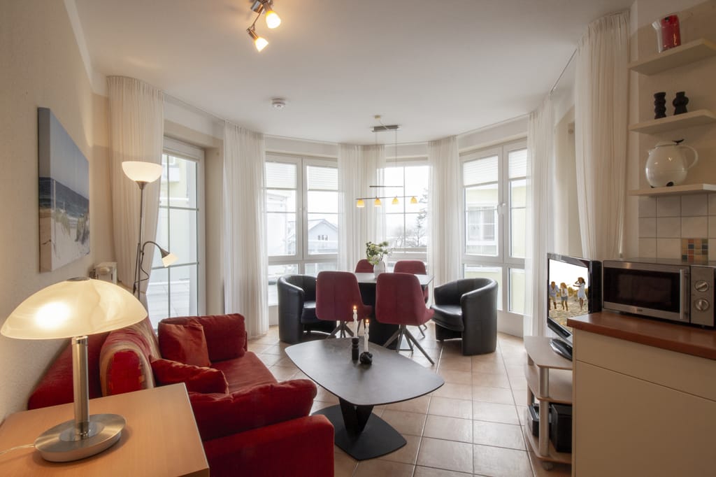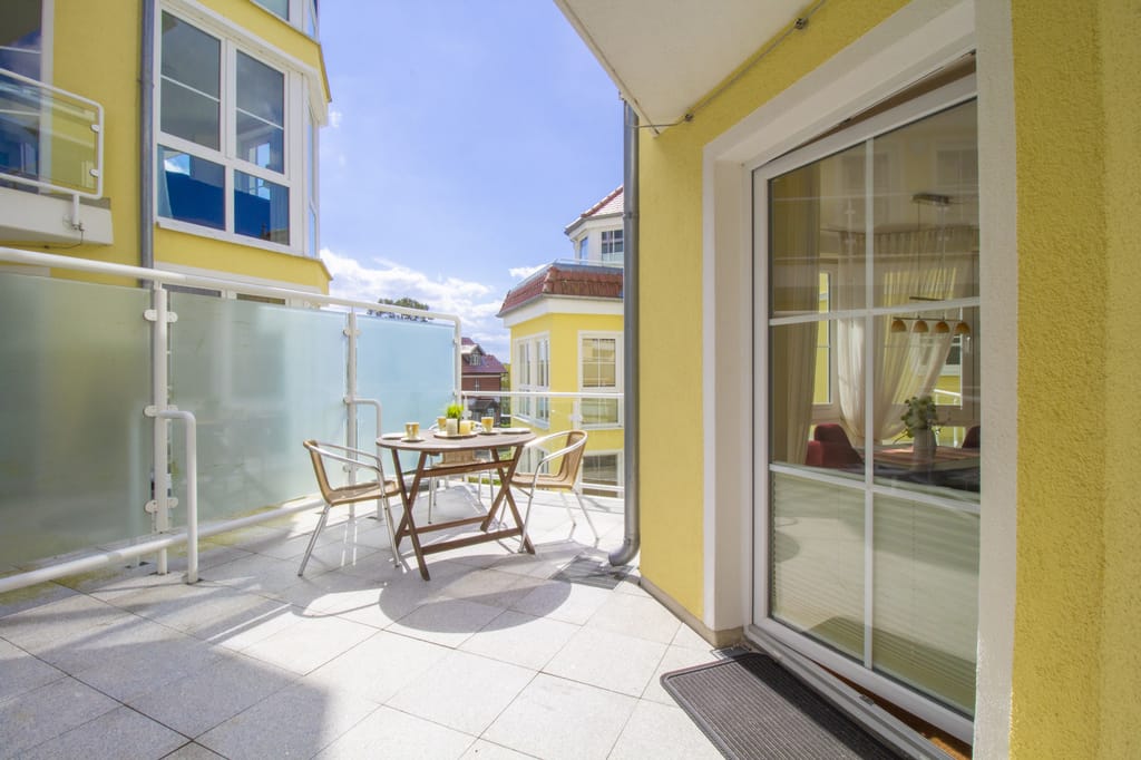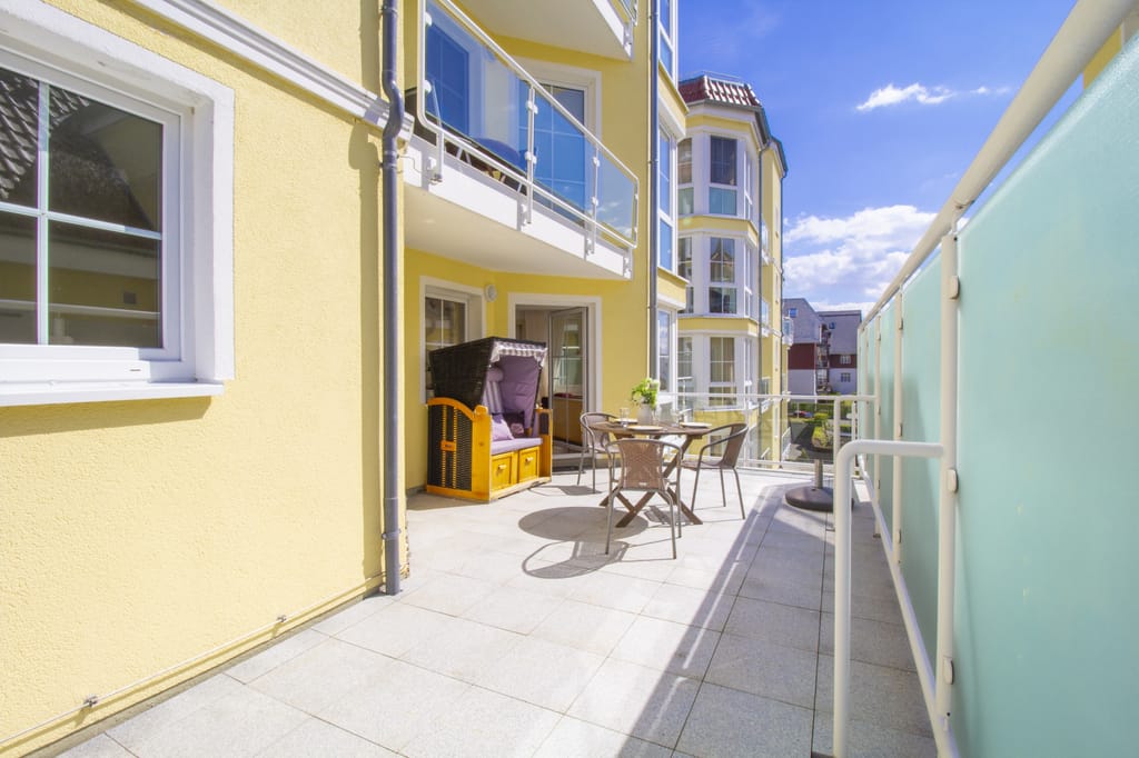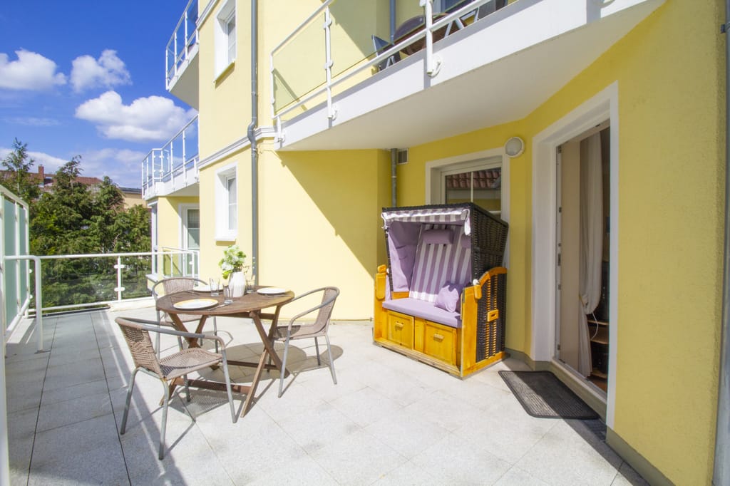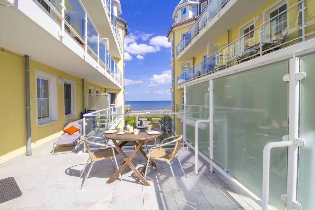 „Die Wohnung ist perfekt und geschmackvoll eingerichtet, es fehlt an nichts. Die große Terrasse mit Strandkorb und Liegen haben uns besonders gut gefallen und von der 2. Terrasse der Blick auf die Ostsee.“