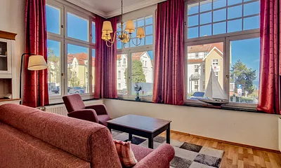 80 qm, offener Wohnraum mit voll ausgestatteter Küchenzeile, Hauptschlafzimmer mit Doppelbett, Einzelbetten im 2.SZ,, 2 Balkone, Ostseeblick, Waschmaschine/Trockner gegen Gebühr,
