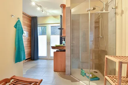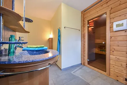 Sauna befindet sich im Erdgeschoss des Hauses, in einem der beiden Badezimmer.