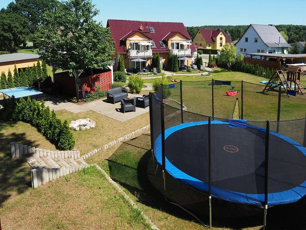 Der Garten mit Tischnennisplatte, Trampolin, Sandkasten und Spielplatz kann von unseren Gästen jederzeit genutzt werden.