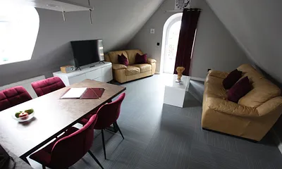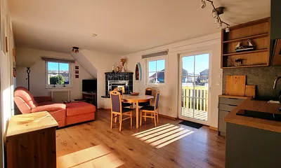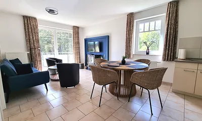 61 qm, stilvolle 3-Raum-Wohnung mit Terrasse, priv. Sauna, Tageslichtbad, 2 Schlafzimmer, allergikerfreundlich, private Sauna, Waldblick, lokale Kunstwerke,