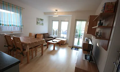 75 qm, Wohnzimmer Eßecke, Kamin, Einbauküche, 2 Schlafzimmer mit Doppelbett, 1 Schlafzimmer mit Etagenbett, sep. WC, Elektrokachelkaminofen, Tageslichtbad, sep. 2. WC