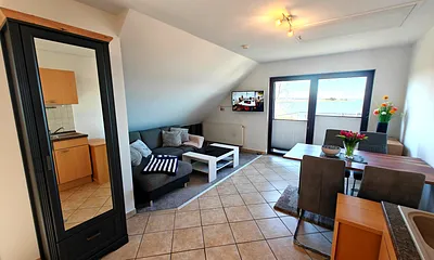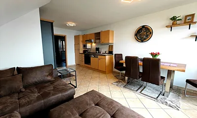 52 qm, Wohn- Schlafraum TV, Leder Schlafcouch, 1 Schlafzimmer mit gr. Doppelbett/TV, Swimmingpool + Außenwhirlpool, 14 qm Terrasse mit Markise, 60 qm eingezäunter Rasen/Grünfläche