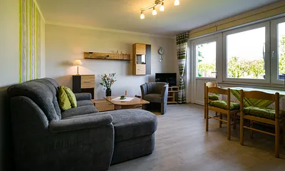 60 qm, Wohnzimmer, Schlafzimmer mit Doppelbett und Etagenbett, Terrasse mit Grillmöglichkeit, Garten