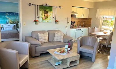45 qm, Wohnbereich mit kleiner offener Küche und Essbereich, zwei Schlafzimmer mit Doppelbetten (1,80m und 1,40m), Seeblick von der Terrasse