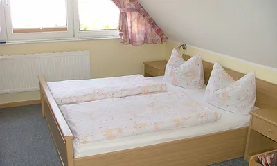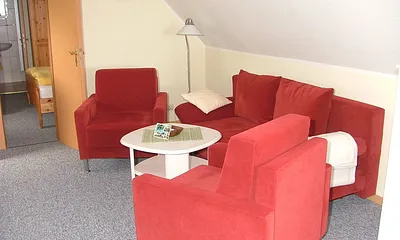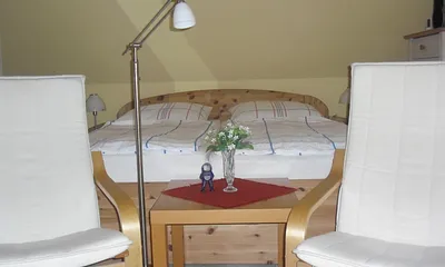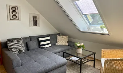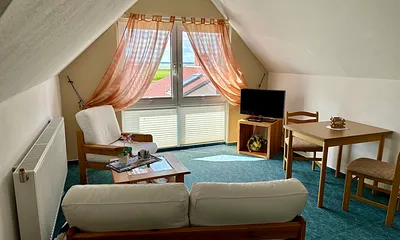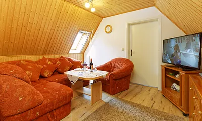 max. 3 Personen, 40 qm, Wohn und Schlafraum in der ersten Etage, Dachschräge