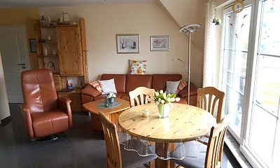 max. 7 Erwachsene und 1 Kind im Alter von bis zu 2 Jahren, 120 qm, Wohndiele mit Küche, 2 Schlafräume mit Doppelbett und Sitzecke, 1 Schlafraum mit Doppelstockbett und Liege, Eigener Eingang, Balkon, Kamin, 2 Bäder