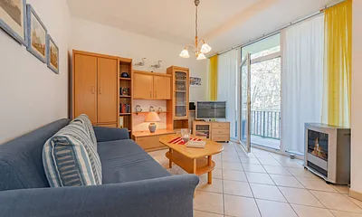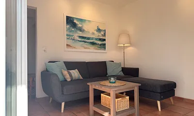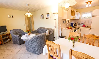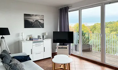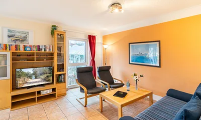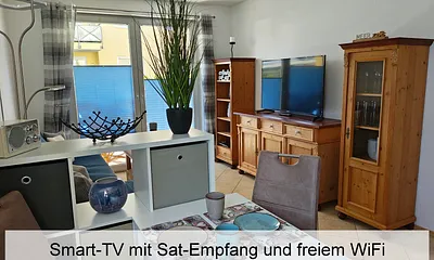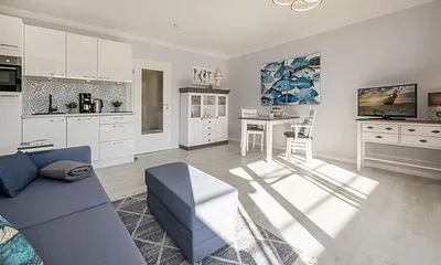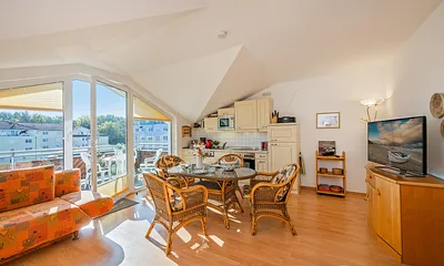 max. 4 Erwachsene und 1 Kind im Alter von bis zu 3 Jahren, 56 qm, offener Wohnbereich mit Küchenzeile, Schlafzimmer mit Doppelbett, Aufbettung Schlafcouch für 3.+4. Person,, strandnah, Balkon, Wellnessbereich, Hauswirtschaftsraum,