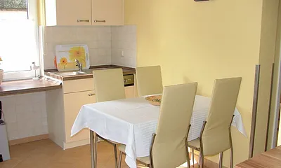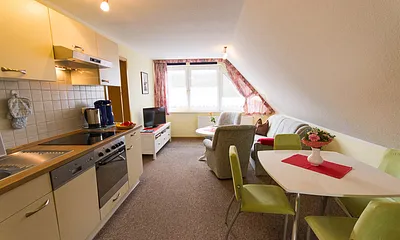 max. 2 Personen, 30 qm, Wohnraum mit Essbereich und Küchenzeile, Schlafraum für 2 Personen, Dachschrägen