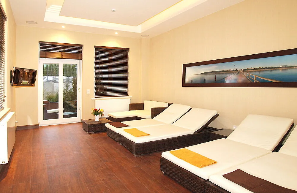Der moderne Wellnessbereich befindet sich im Erdgeschoss. Warme Farben, mediterrane Möbel und hochwertige Materialien dominieren die Inneneinrichtung. Es erwarten Sie eine finnische Sauna, bequeme Relaxliegen, ein schwenkbarer Flat-TV sowie eine Ruhezone im Grünen.